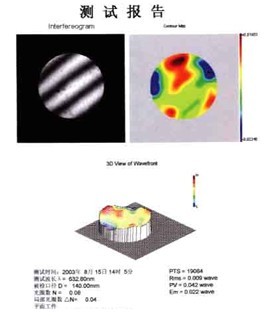一,数字激光平面干涉仪用途和特点: 可广泛适用于计量实验室对高精度平面的平面度检测和鉴定。能根据不同的要求打印出各种平面度测试的彩色等高图以及三维立体透视图。并给出波峰波谷值(PV),最大面形误差(Em),均方根值(Rms),光圈数等面形评价参数。人体温度对测量可靠性的影响为最小。 仪器的配套性:(选配) 1,连接监视器 移相式数字波面干涉仪、1/3英寸CCD、14″监视器、扫描驱动器、驱动器电源、EPSON720彩色打印机。 2,连接电脑软件分析 电脑最低配置要求:CPU 双核以上,2G内存,320G硬盘,512M显存显卡,视频捕捉卡